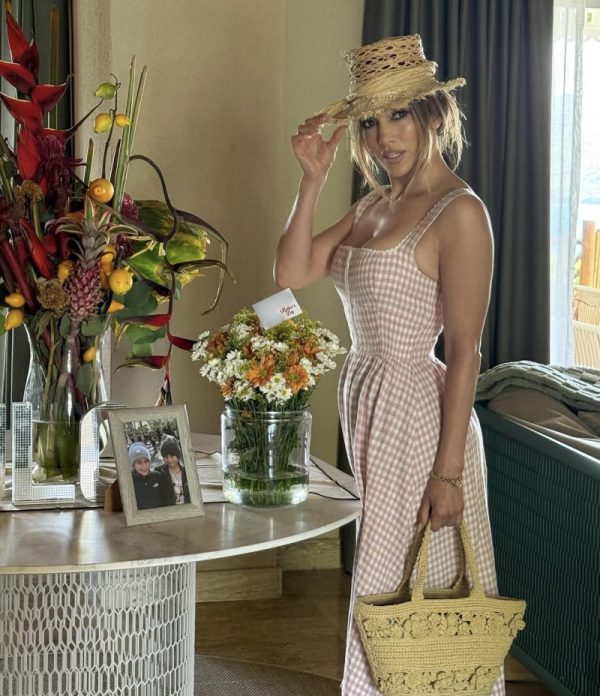 En las fotografías luce un vestido de cuadro color rosa y sombrero mientras posa a la cámara.