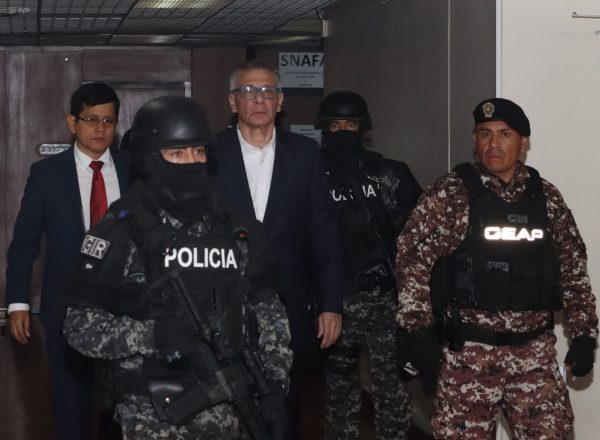 Glas fue trasladado desde la cárcel de máxima seguridad La Roca, en Guayaquil, para participar de forma presencial en la audiencia de juicio que se desarrolla en la sala de audiencias de la CNJ; permanecerá en Quito hasta que se le evalúe psiquiátricamente.