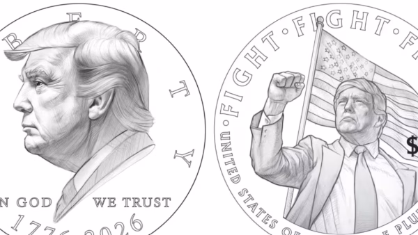 Los bocetos muestran el perfil de Trump en el anverso, con la palabra “Liberty” en la parte superior, “In God we Trust” en la parte inferior y las fechas 1776 y 2026. En el reverso aparece la famosa imagen de Trump levantando el puño tras el intento de asesinato en Butler, Pensilvania, con las palabras “FIGHT FIGHT FIGHT” en la parte superior y una bandera estadounidense ondeando detrás de su cabeza.