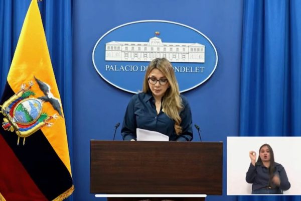 Carolina Jaramillo empezó el informe semanal, desde el Palacio de Carondelet, en el Centro de Quito, con una proclama: “Ecuador ha decidido avanzar y no retroceder a pesar de los intentos de pocos que buscan el caos“.