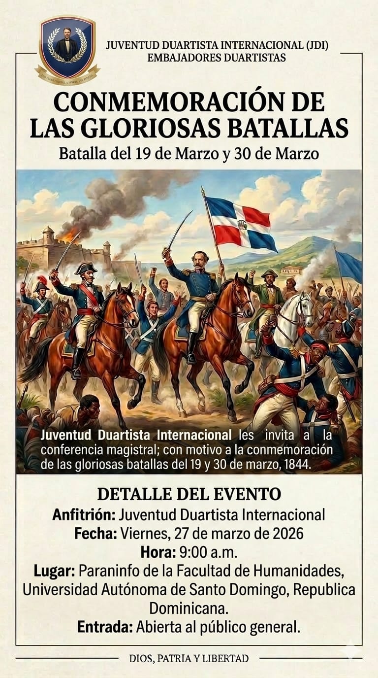 Bajo el título “Reflexión crítica sobre las batallas del 19 y 30 de marzo: pilares de la soberanía e identidad nacional”, este encuentro se propone examinar, desde una perspectiva histórica y geopolítica, el impacto decisivo de las batallas de Azua y Santiago en la consolidación de la independencia proclamada el 27 de febrero de 1844.